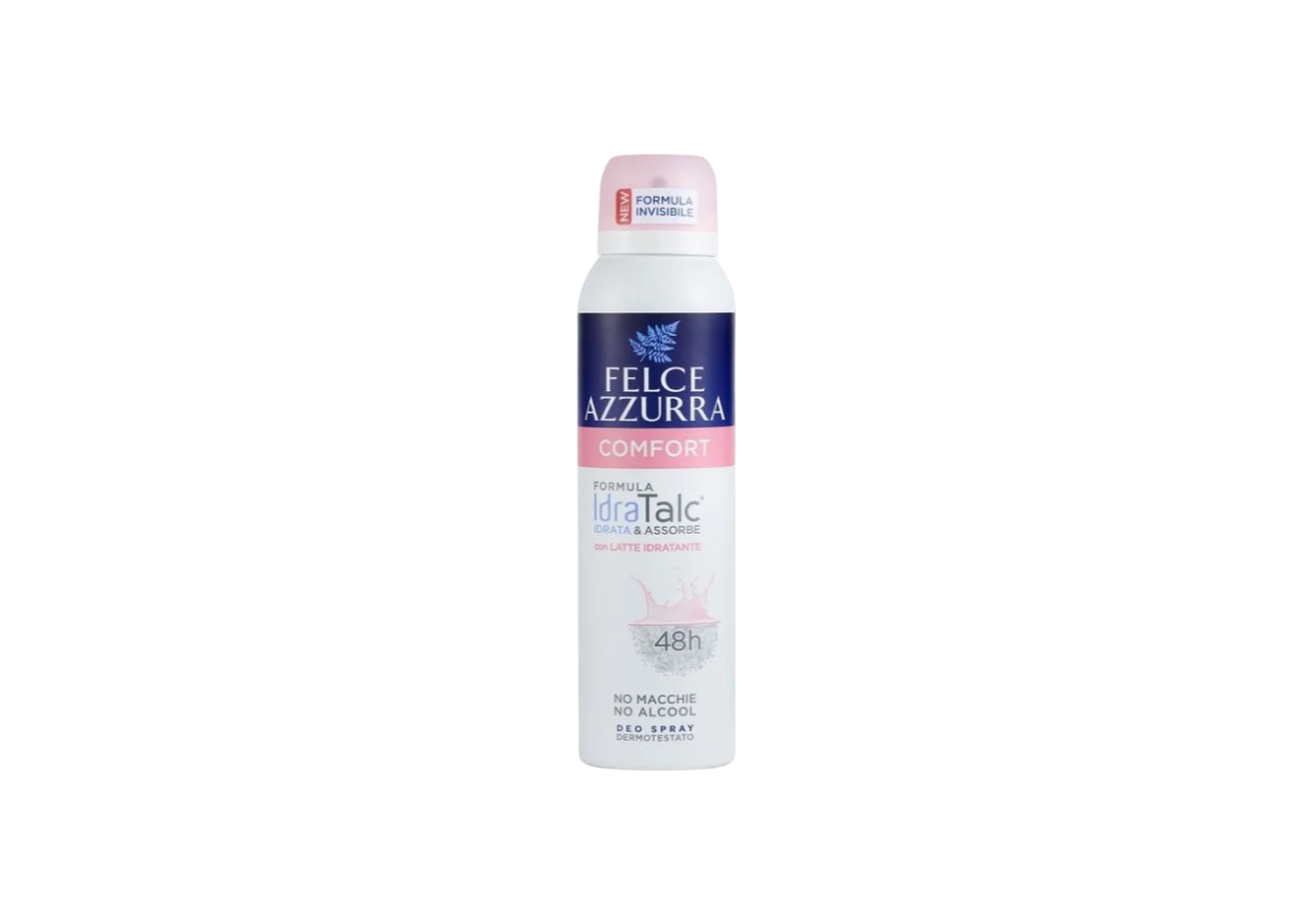 Felce Azzurra Comfort dezodorans 150ml pruža dugotrajnu zaštitu od neprijatnih mirisa i osećaj prijatne svežine tokom celog dana. Ne sadrži alkohol i blag je prema koži. 🌿 Nežna zaštita i udobnost 🛡️ 24h zaštita 🧴 Ne iritira kožu Uputstvo za upotrebu: Dobro promućkati i naprskati sa udaljenosti od 15 cm na čistu i suvu kožu ispod pazuha.