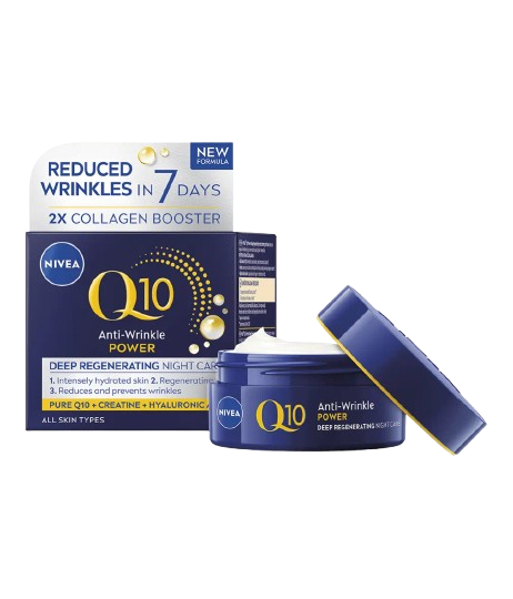 Nivea Q10 noćna krema obnavlja kožu tokom noći i vidljivo smanjuje bore. Hranljiva formula sa koenzimom Q10 i kreatinom podstiče regeneraciju kože. 🌙🛏️
