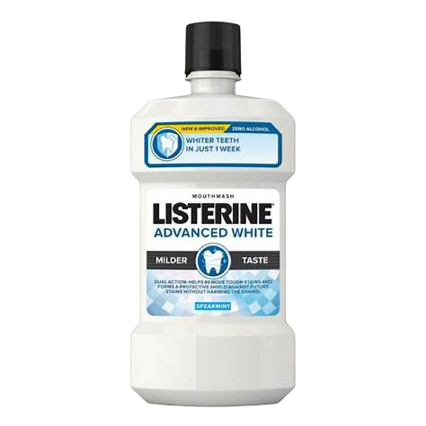 Listerine Advanced White u pakovanju od 250ml osvetljava zube i uklanja mrlje bez abrazivnih čestica. Klinički testirana formula za svakodnevnu upotrebu. 🦷✨